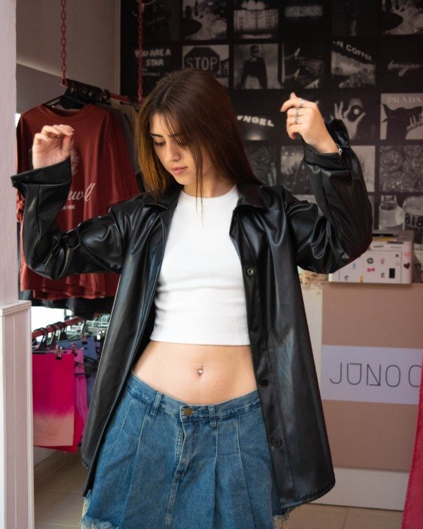 Camisaco oversize en ecocuero negro, liviana y con brillo sutil. Un básico canchero para elevar cualquier outfit.
