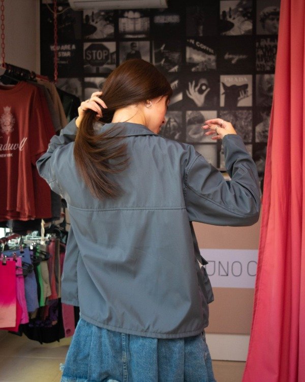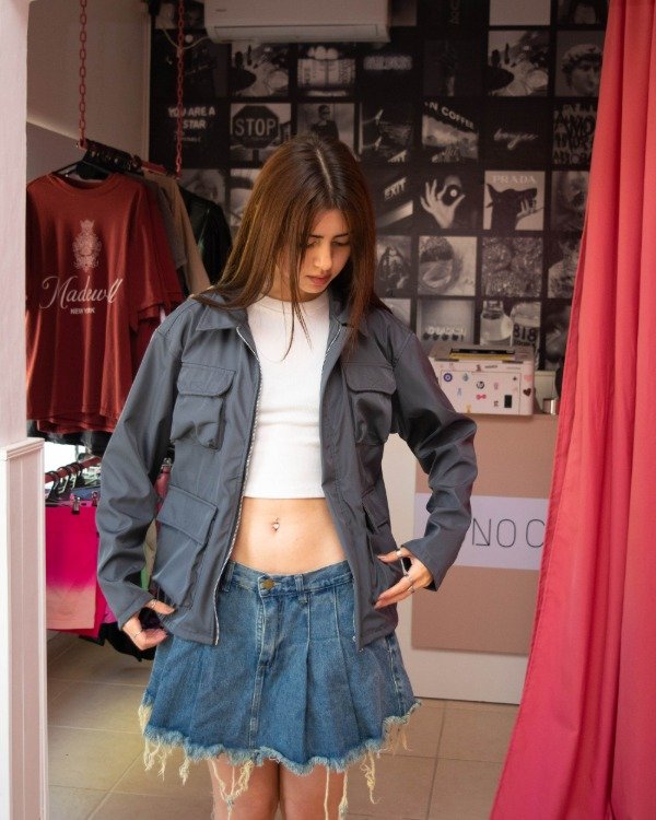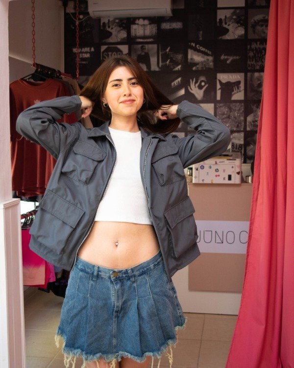 Campera gris con bolsillos y cierre frontal, cómoda y práctica. Ideal para un look urbano y relajado de media estación.