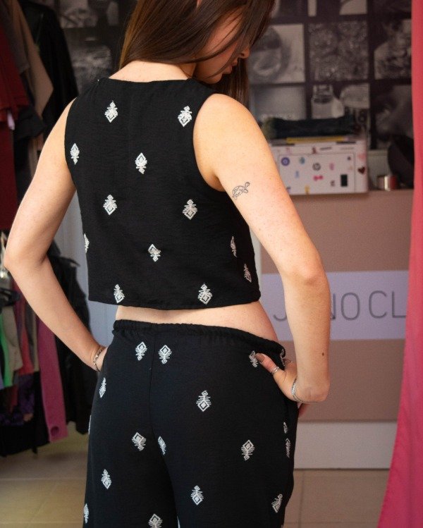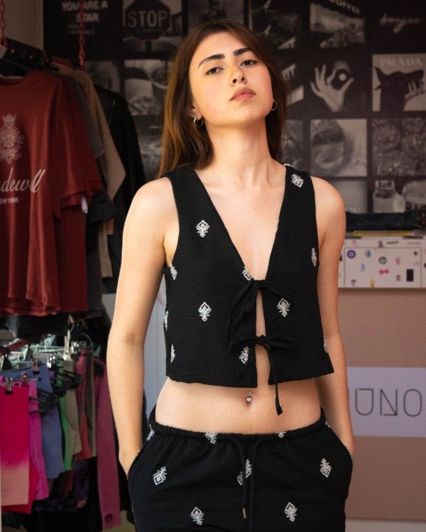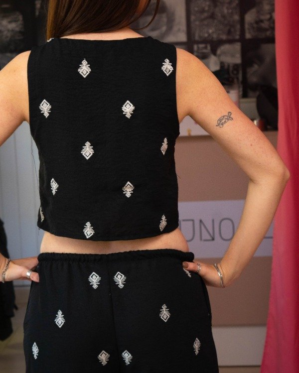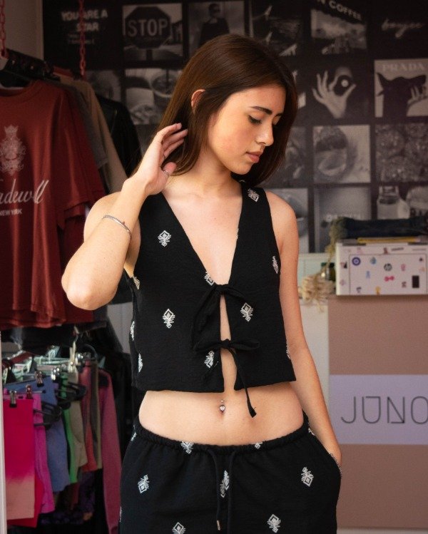 Top negro bordado, de corte relajado, con cierre de lazos. Ideal para combinar en un look relajado y elegante que se lleve todas las miradas. COMBINABLE CON EL PANTALON MEMPHIS