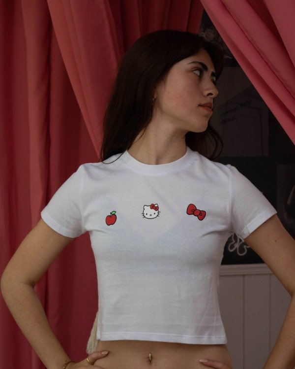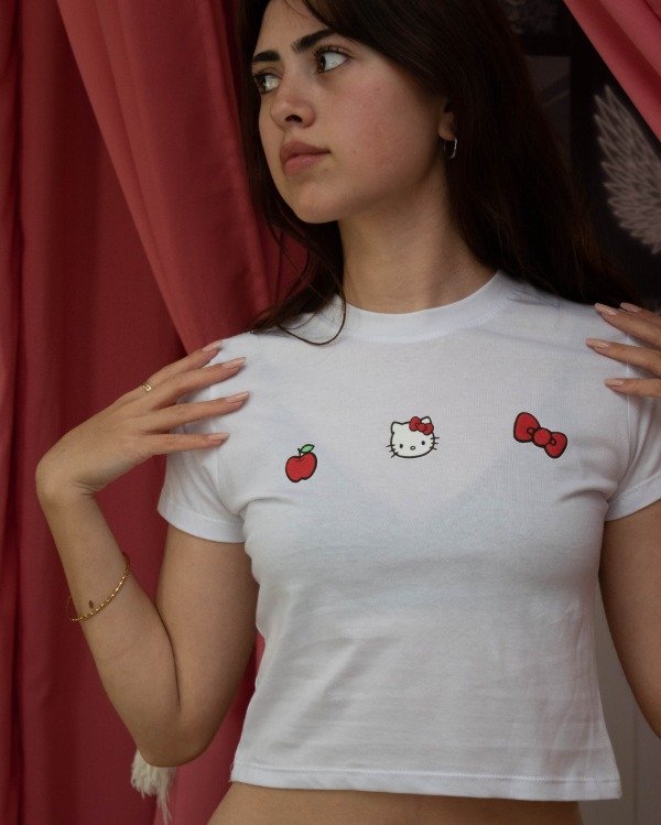 La ternura en versión minimalista. Camiseta blanca crop con estampado frontal de manzana, Hello Kitty y moño rojo. Perfecta para un look dulce y juvenil. 🍎🎀🐱