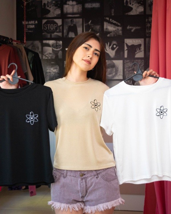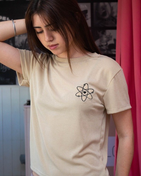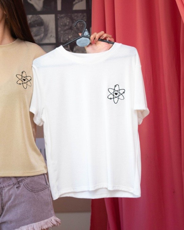 Remera con detalle minimal de átomo. Básica pero con personalidad, perfecta para sumar a cualquier look. ⚛️🤎
