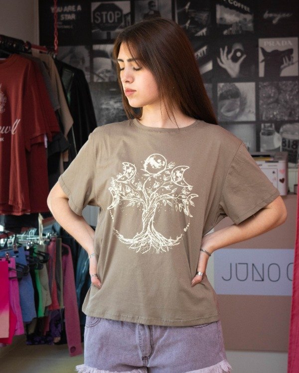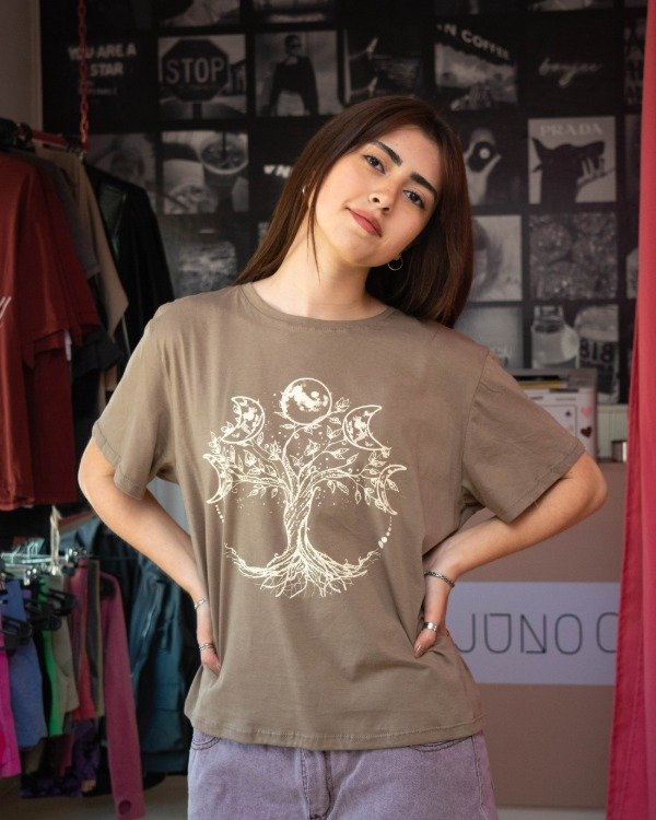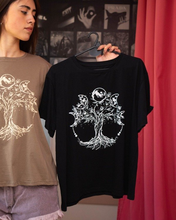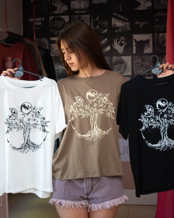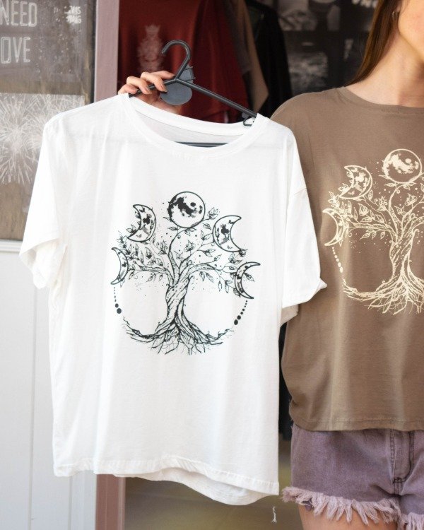 Remera color en tres colores clásicos con estampa de árbol y fases lunares. Fresca, cómoda y con vibra natural. 🌙🌱