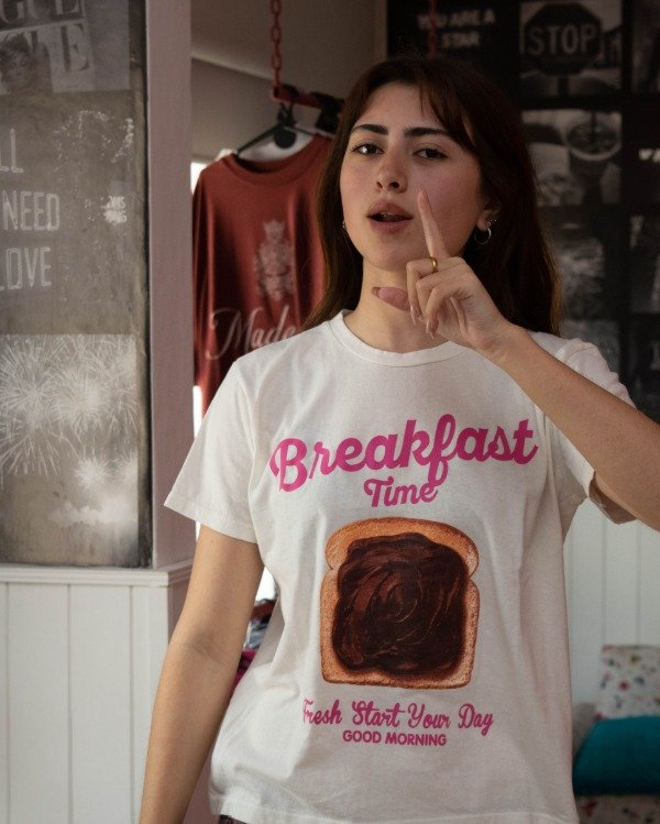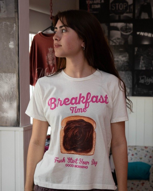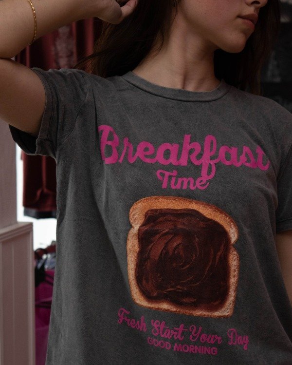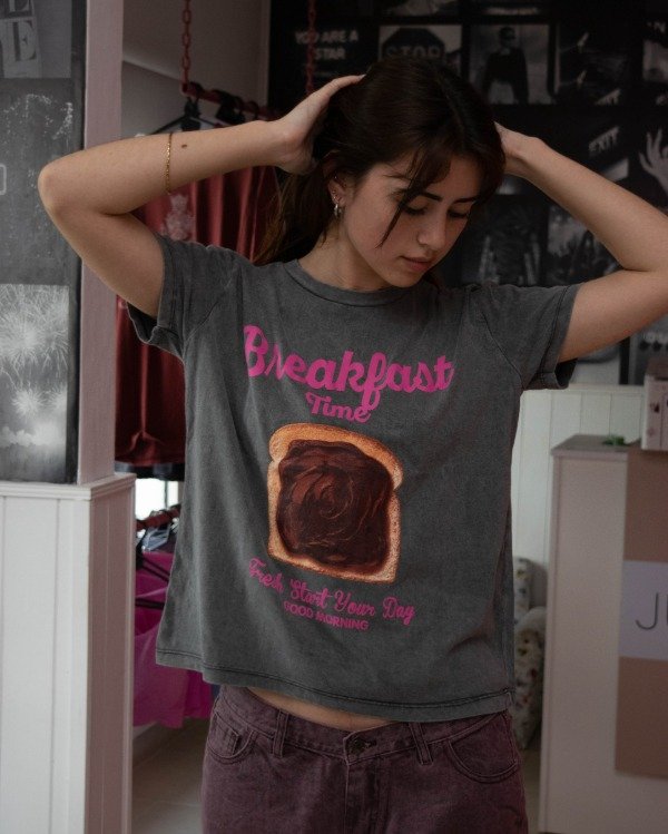¡El desayuno nunca pasa de moda! Camiseta gris con print colorido de tostada y letras en rosa. Su aire divertido la convierte en la prenda ideal para días relajados. 🍳☕🥞