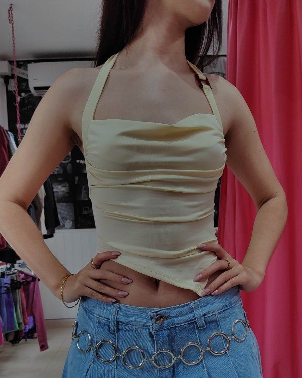 De breteles finos con amarre al cuello, escote drapeado y corte asimétrico en punta, es la prenda ideal para un look sexy y sofisticado sin perder frescura.