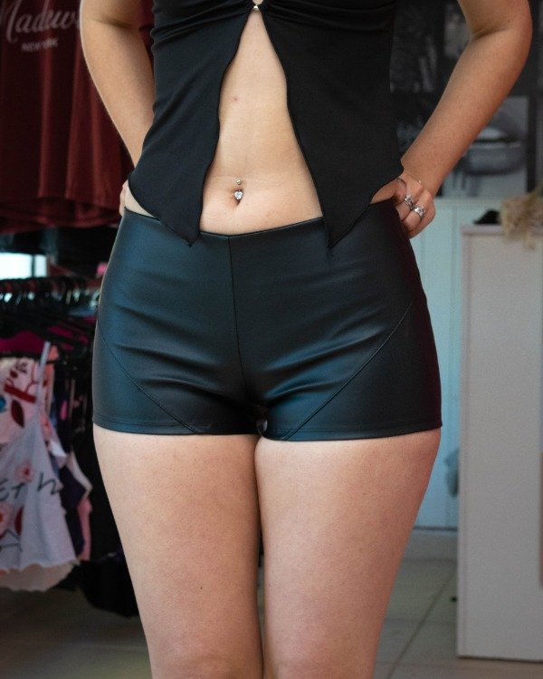 Short de eco-cuero engomado, tiro alto y corte simple. Ajustado y versátil, una prenda clave para combinar de día o de noche.