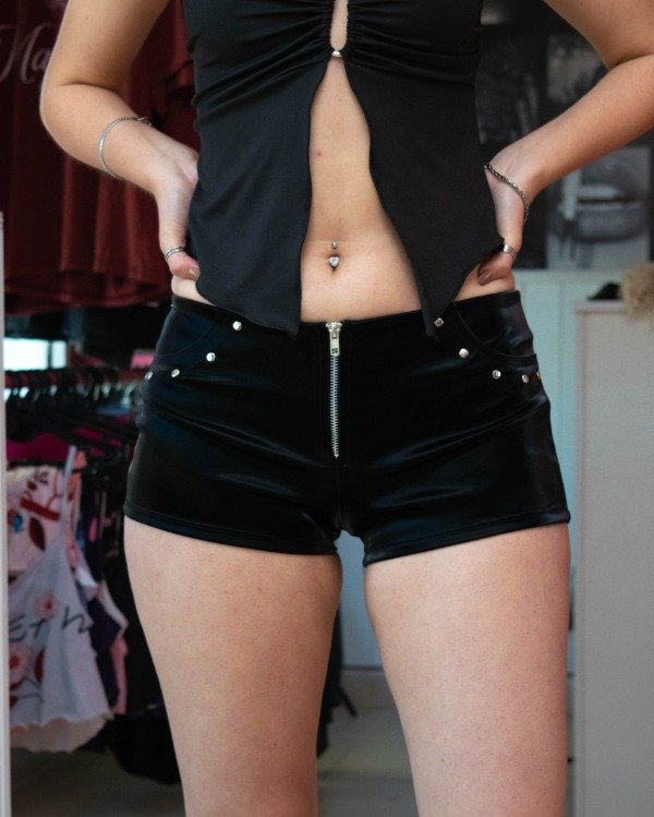 Short de tiro medio en material engomado con cierre metálico frontal y detalles de tachas en los bolsillos. Toque rockero para destacar en cualquier salida.